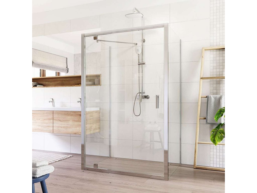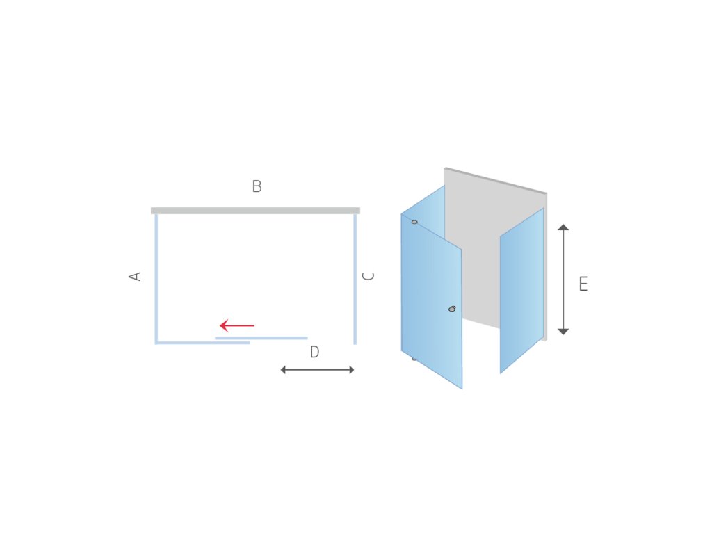 Hliníkové profily v barvě chrom, dveře pivotové, sklo Čiré, síla skla 6 mm, rozměr 900x800x900 mm, výška 1900 mm.