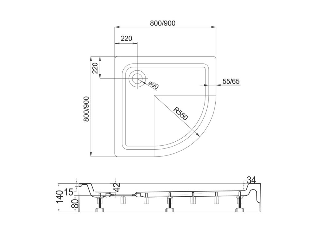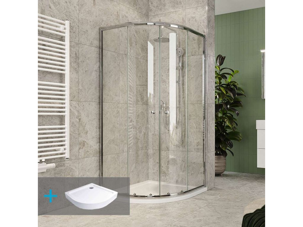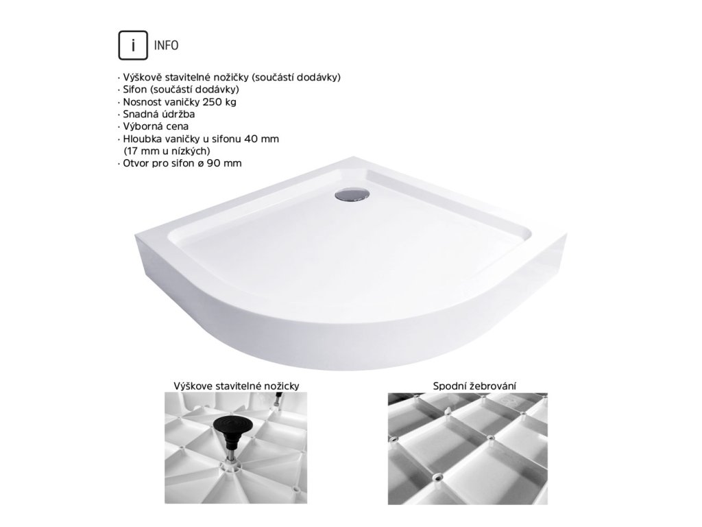 Set čtvrtkruhového sprchového koutu, síla skla 4 mm, sprchová vanička R550, 90x90x14 cm, SMC, bílá, včetně nožiček a sifonu.