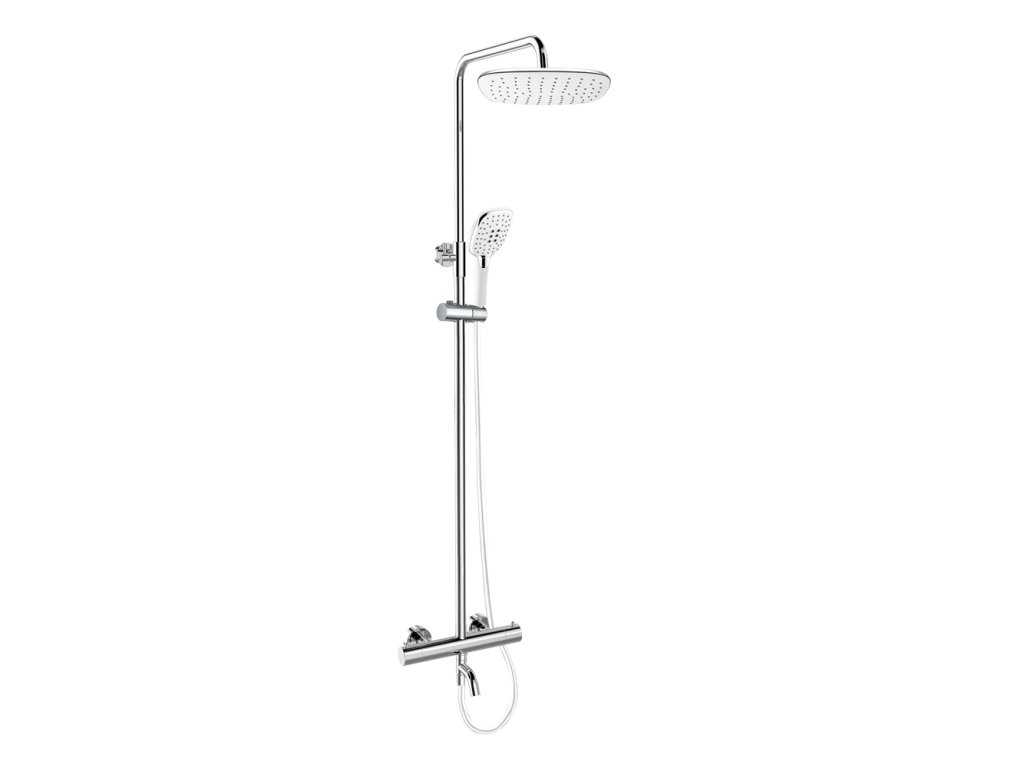 Termostatická nástěnná vanová baterie 150 mm, s nastavitelnou teleskopickou tyčí, bílou sprchovou hadicí 150 cm, ruční a talířovou hranatou sprchou, 300x190 mm, bílá