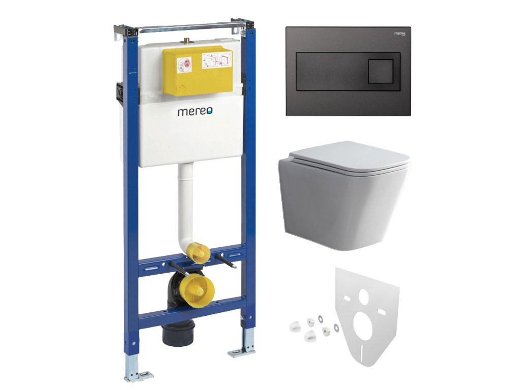 Mereo WC set - Smart flush rimless WC hranaté, modul pro sádrokarton, černé hranaté tlačítko MM02NSETRT331