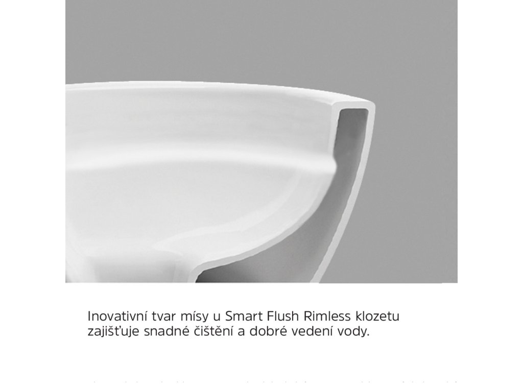 Smart flush rimless rimless je inovativní způsob oplachu WC klozetu.Vylepšený způsob vedení vody ve tvaru vodního víru zajišťuje účinnější oplach toalety a silnější působení vody na oplachovanou mísu. Nespornou výhodou je také výrazně tišší splachování, jelikož plynule proudící voda má sice vyšší intenzitu oplachu, ale vytváří nižší hluk než proud vody tříštící se více směry.