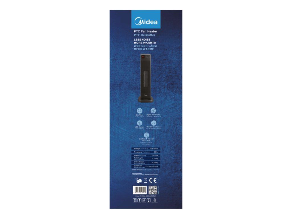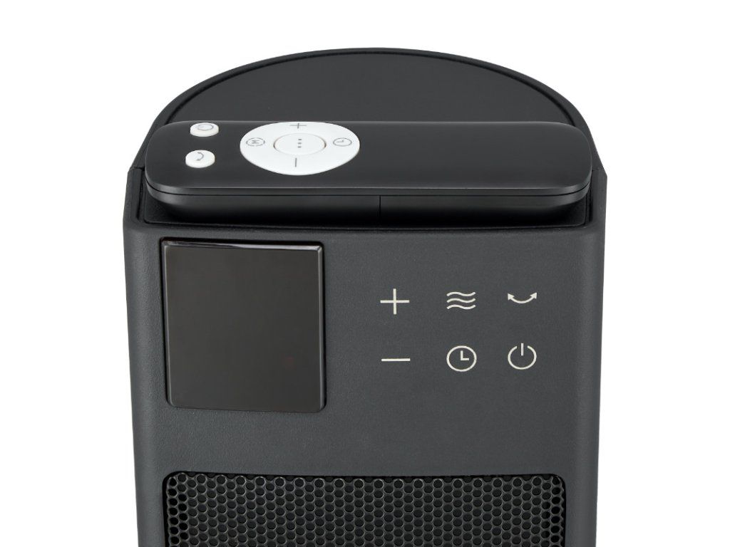 | • výkon: 1200/2000 W • digitální termostat • dálkové ovládání • LED displej • 3 režimy: topení, ventilátor, ECO • časovač 24 hodin • ochrana proti přehřátí a převrácení • provozní plocha: 10 m2 • 765 x 200 x 196 mm |