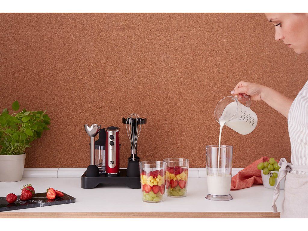 Ano, příslušenství, kterým jsme tyčový mixér VitalStick vybavili, je skutečně bohaté. Základní tyčový nástavec můžete nahradit nerezovou metličkou na sníh nebo nástavcem na přípravu hebkého, hladkého pyré. O stojanu jsme se už zmínili, o nádobách ne, že? K VitalSticku jsou hned dvě. Kvalitní, transparentní s měrnou stupnicí. A spolu s ostatním příslušenstvím je samozřejmě můžete mýt i v myčce.