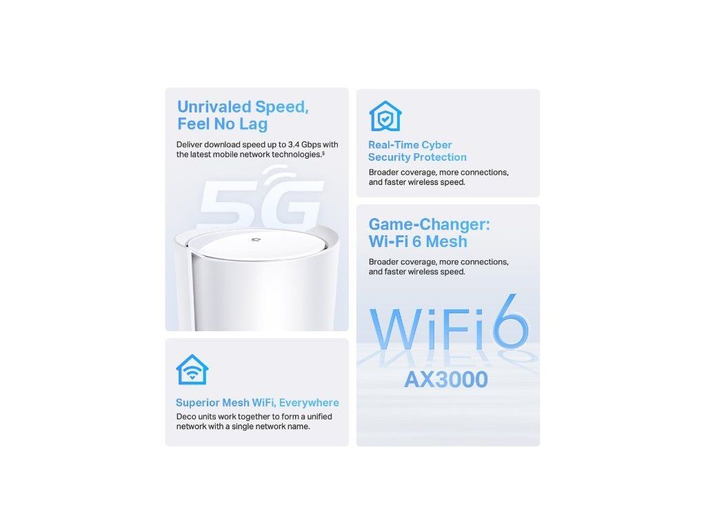 Technologii Wi-Fi 6 si oblíbíte. Jde totiž o systém navržený tak, aby pokryl celou domácnost a zaručil větší rychlost a 4x vyšší kapacitu. Zároveň k němu připojíte více než 150 zařízení a užijete si luxus, který vám Deco X50-5G poskytne. 5G navíc poskytuje rychlé síťové připojení s velmi nízkou latencí 1 ms.