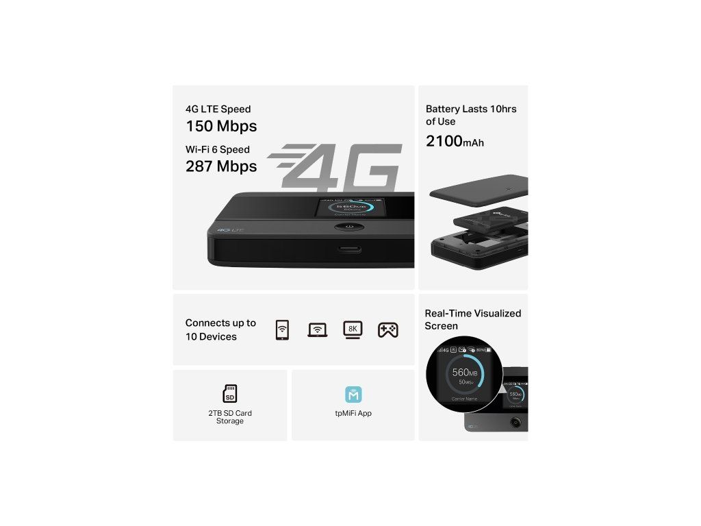 Vestavěný displej přehledně zobrazuje všechny důležité informace – stav baterie, připojení, typ sítě, sílu signálu i využití dat. Díky aplikaci tpMiFi můžete jednoduše spravovat přístupová zařízení, nastavovat limity nebo sdílet soubory z microSD karty až do velikosti 2 TB.