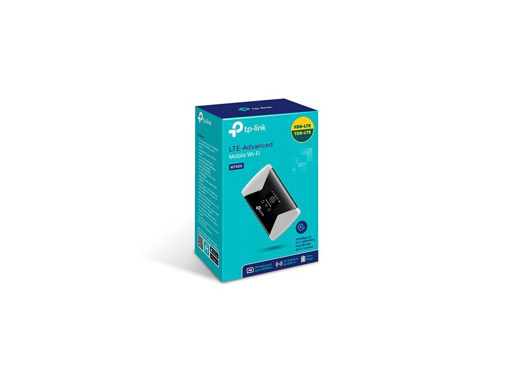 M7450 je kapesní 4G LTE router značky TP-Link, má integrovanou Dual Band WiFi - 300 Mbps ve 2.4GHz pásmu a 866 Mbps v 5GHz, vestavěnou baterii s kapacitou 3000 mAh s výdrží až 15 hodin, SD slotem pro karty do kapacity až 32GB a širokou podporou LTE kanálů.