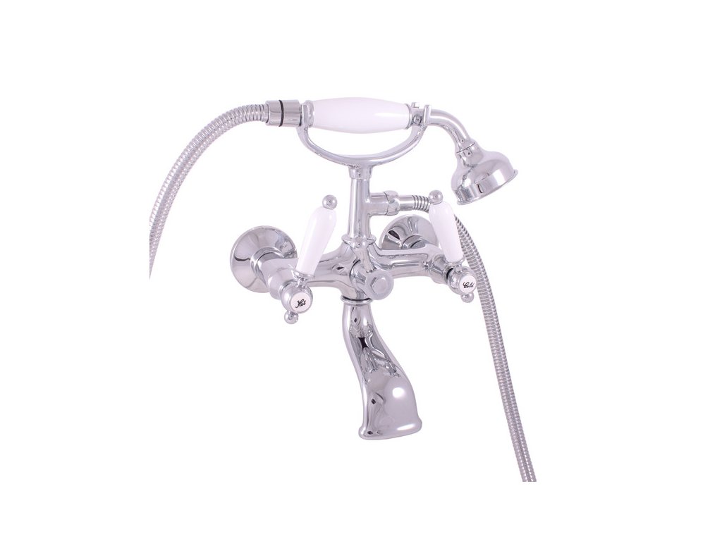 Vodovodní baterie vanová nástěnná s vidlicí na odkládání sprchy a se sprchou.