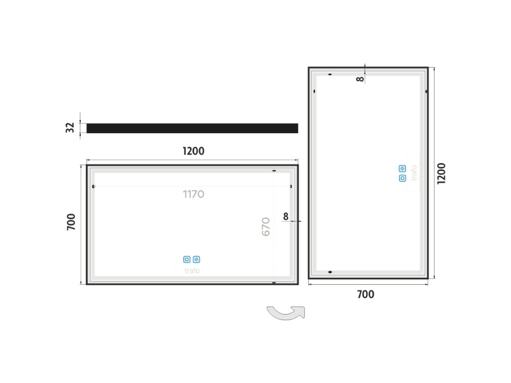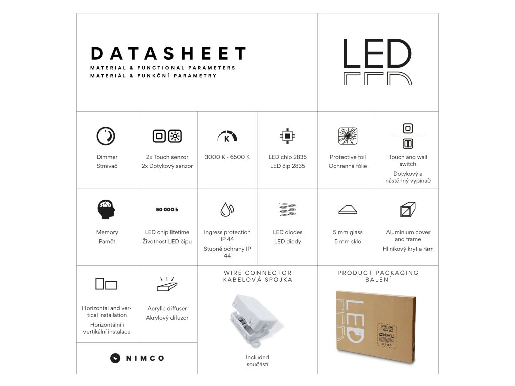 Obdélníkové zrcadlo s rámem s ostrými rohy a celoobvodovým svícením pro dokonalé a rovnoměrné osvětlení. Zrcadlo se ovládá dvěma dotykovými podsvícenými senzory, které umožňují změnu barvy světla, nastavení intenzity osvětlení (stmívání) a disponují paměťovou funkcí pro uložení posledního nastavení. Kromě toho lze zrcadlo ovládat i pomocí nástěnného vypínače, což zvyšuje jeho flexibilitu a pohodlí použití. Pro dosažení kvalitního a rovnoměrného svícení je použit akrylový difuzor, který zajišťuje měkký a harmonický rozptyl světla bez viditelných bodových zdrojů. LED diody jsou vkusně integrovány do rámu spolu s difuzorem, což přispívá k elegantnímu a čistému vzhledu zrcadla. Zrcadlo využívá nejmodernější LED čipy SMD 2835, které jsou známé svou vysokou svítivostí, energetickou úsporností a dlouhou životností. Hustota čipů 96+96/m (192/m), životnost 50 000 hodin. Parametry LED: Survival Factor = 1, Lumen Maintenance Factor 0,99 a Flicker Metric 0,02, pak zajišťují stabilní, bezblikavé a dlouhodobě konzistentní osvětlení. Nosná konstrukce zrcadla je vyrobena z masivního hliníkového rámu o rozměrech 32x19 mm, který zajišťuje vysokou pevnost a stabilitu. Stejně tak je z hliníku vyroben kryt zdroje a všech elektronických součástek. Sklo o tloušťce 5 mm je opatřeno bezpečnostní fólií, která chrání před zraněním v případě rozbití. Zrcadlo navíc disponuje stupněm ochrany proti vlhkosti IP44, což zaručuje spolehlivost i v prostředí s vyšší vlhkostí. Zrcadlo splňuje všechny české normy a je opatřeno českým certifikátem CE, který zaručuje jeho kvalitu a bezpečnost. Nabízí flexibilní možnosti upevnění, a to jak vertikálně, tak horizontálně, a je dodáváno včetně kompletní montážní sady a kabelové spojky s ochranou IP44. Pro zajištění bezpečné přepravy je zrcadlo pečlivě zabaleno a připraveno k expedici prostřednictvím kurýrní služby. Ovládání: Dotykové senzory + možnost ovládání nástěnným vypínačem Nastavení barvy světla: Ano Barva světla: Nastavitelná v rozsahu 3000–6500 K (od teplé po studenou bílou) Funkce stmívání: Plynulé stmívání Paměť nastavení: Automatická paměť nastavení Konstrukce svícení: K rovnoměrnému rozptylu světla zrcadlo disponuje akrylovým matovaným difuzorem Integrace LED: Led diody jsou zabudované v rámu LED čip: Nejmodernější LED čipy SMD 2835 LED pásek - hustota čipů: 192/m (96+96/m) Životnost LED čipů: Až 50 000 hodin Kvalita osvětlení LED: Survival Factor = 1; Lumen maintenance factor = 0,99; Flicker metric = 0,02 Materiál: Zrcadlové sklo, hliník Materiál konstrukce: Rám zrcadla a kryt zdroje jsou vyrobeny z hliníku Tloušťka skla: 5 mm Ochrana při rozbití: Bezpečnostní fólie Stupeň ochrany: IP 44 Certifikace: Český certifikát CE Umístění: Montáž na stěnu Možnost upevnění vertikálně i horizontálně Montážní příslušenství: Součástí balení je montážní sada a kabelová spojka s ochranou IP 44 Obal: Zabalené pro přepravu kurýrní službou Napětí: Vstupní napětí 220-240 V Výstupní napětí 12 V Příkon: 55 W, světelný tok: 3960 lm Rozměr: v: 700 mm š: 37 mm d: 1200 mm Hmotnost: 13,96 kg NIMCO všeobecný ilustrovaný návod k montáži výrobků. Součástí výrobku jsou šrouby a hmoždinky. Lze je použit do betonu a obkladu, který má tloušťku do 8 mm. Správná kombinace použití hmoždinek a šroubů pro: BETON – hmoždinka pr. 6, vrut min. 3,5*40 mm CIHLA – hmoždinka pr. 6, vrut min 3,5*40 mm RIGIPS – hmoždinka uzlovací do sádrokartonu a dutých materiálů pr.6 mm, délka hmoždinky 35 mm, vrut 3,5*40 mm OBKLAD – hmoždinky a šrouby- nutné použít delší o tloušťku daného obkladu (dlažby) Časté chyby při montáži! -vrtání do spáry -použití nesprávné velikosti (průměru a délky) hmoždinek a šroubů -použití nesprávné velikosti vrtáku -zanesený otvor po vyvrtání -použitá hmoždinka vyčnívá nad obklad. Hmoždinka musí být v jedné rovině s obkladem. V opačném případě výrobek na obkladě nedrží a vyviklá se! -výrobek nebude na stěně uchycený v jedné rovině, pokud budou chybně vyvrtané otvory Svítidlo je svojí podstatou bezúdržbové. Vnější povrch svítidla ošetřujte pouze měkkým hadříkem lehce navlhčeným vodou. Nepoužívejte žádné agresivní čistící prostředky ( zejména s obsahem chlóru a jeho derivátů), které mohou způsobit oxidaci zrcadloviny. Vnitřní prostor svítidla nevyžaduje žádnou údržbu. V případě poškození ochranného krytu je nutné jej vyměnit v servisním středisku výrobce. Pro čištění zrcadel stačí používat hadříky, které lze objednat pod artiklovými čísly RP 1006 a RP 1006 SET. Tyto hadříky jsou skvělými pomocníky v domácnosti, ideálními především pro čištění zrcadlových a skleněných povrchů. Díky jejich vysoké kvalitě zajistí dokonalý výsledek při každém použití, a to bez nutnosti použití chemických prostředků. Pozor! Nikdy neprovádějte jakékoliv operace na svítidle, pokud je zapnuté, svítí a je pod elektrickým napětím. Elektrické vybavení svítidla je bezúdržbové, pouze v případě poruchy světelného zdroje je třeba jej vyměnit. Pro opravy kontaktujte prodejce nebo výrobce. Veškeré práce ne elektrickém zařízení může provádět pouze osoba k tomu způsobilá, dle místních předpisů. Na výrobek je poskytována zákonná záruční doba 2 roky. GPSR GPSR informace o výrobci.Doplňkové parametry
