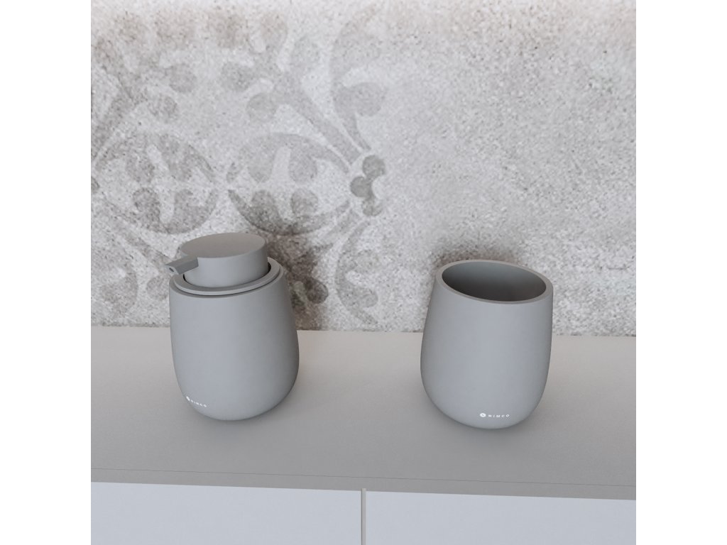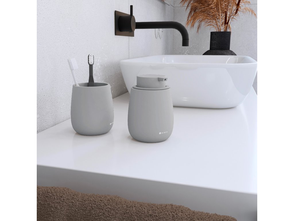 V sadě dávkovač tekutého mýdla, pohárek na kartáčky a WC kartáč. Nádobky keramické světle šedé matné. Objem dávkovače 425 ml. Pumpička plast. Rukojeť kartáče nerez ocel. Soft-touch povrch.