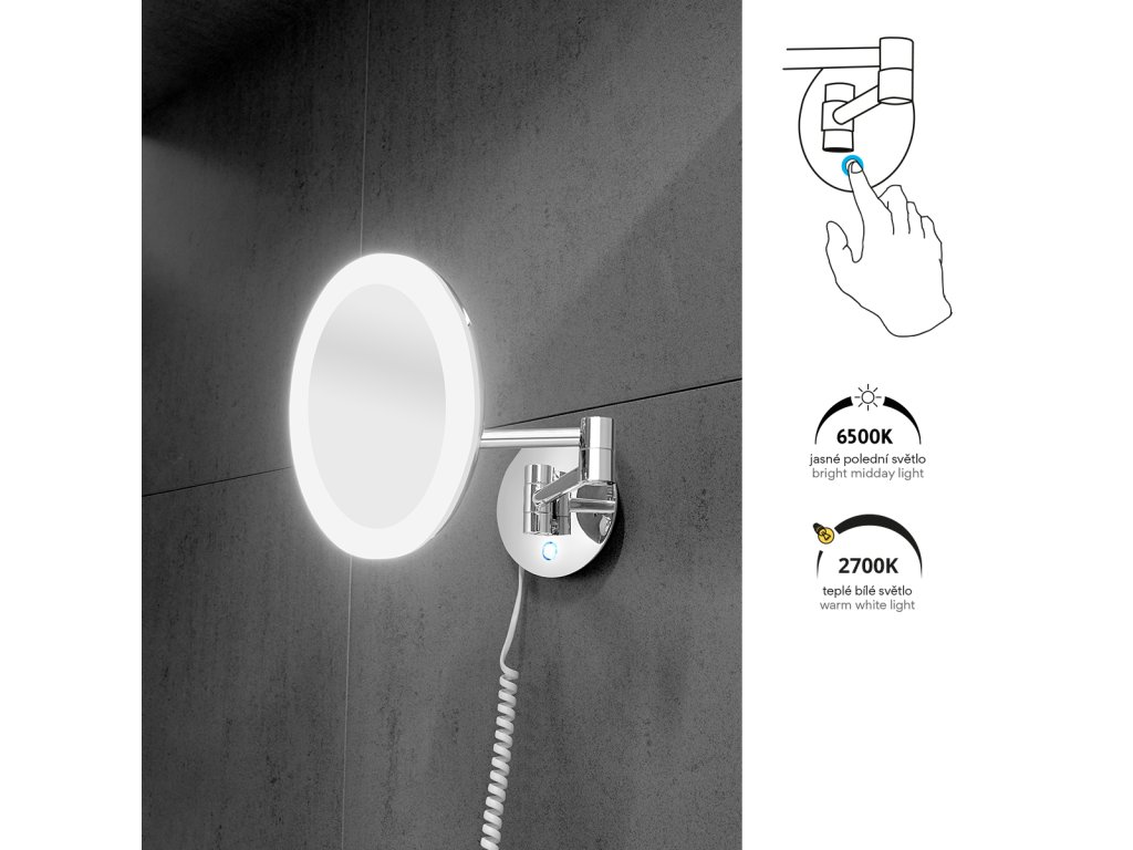 LED zvětšovací zrcátko s dotykovým podsvíceným senzorem s nast.teplotou chromatičnosti 6500 / 2700 K. Zvětšení 5x.