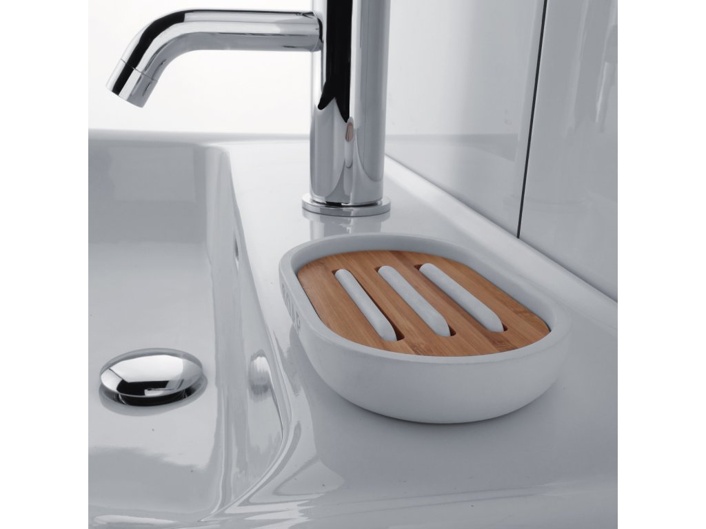Mýdlenka. Barva bílá. Materiál polyresin, bambusové dřevo.