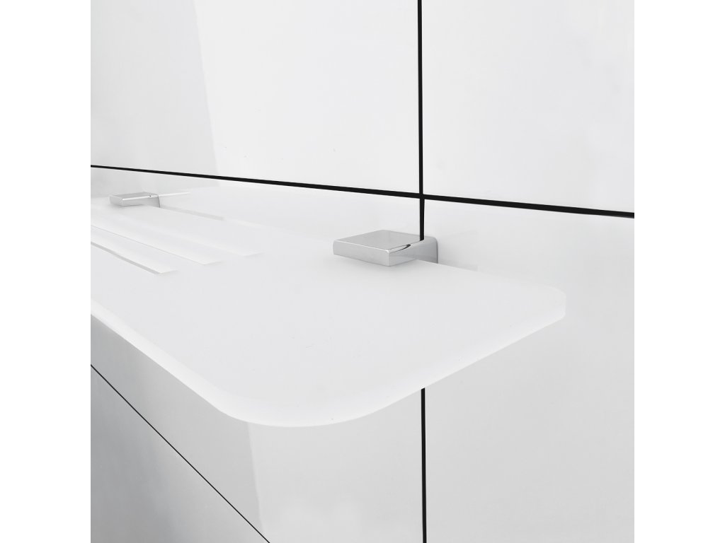 Police s frézovanými otvory. Materiál plexiglass s matným povrchem. Délka 40 cm. Úchyty mosaz / chrom.