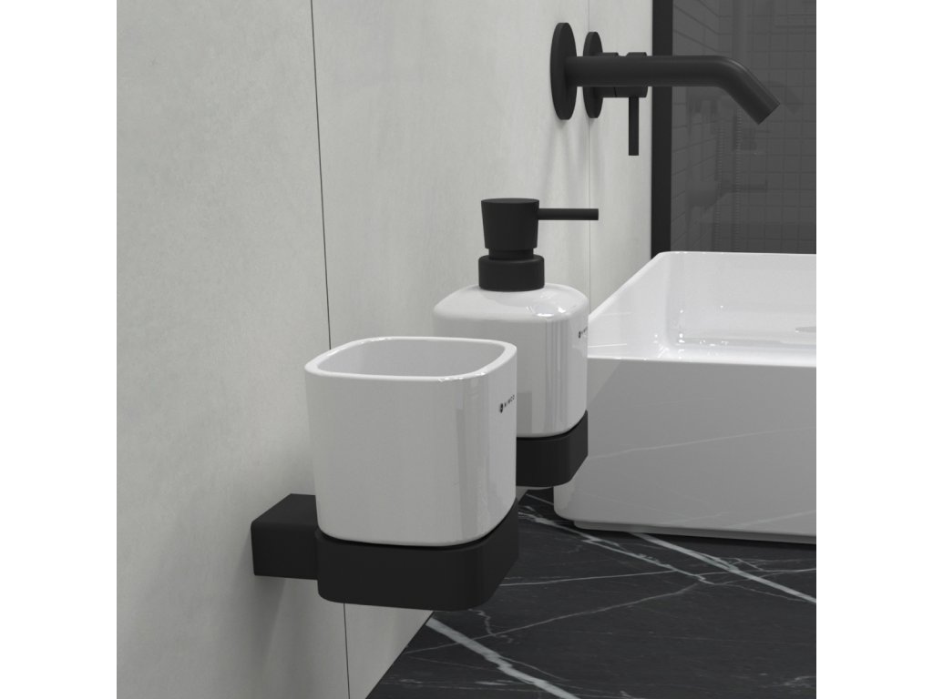 Sada keramických nástěnných koupelnových doplňků - dávkovač mýdla, držák kartáčků, háček na ručník je skvělým doplňkem do koupelny. Tato sada koupelnových doplňků obsahuje následující výrobky NIMCO ze série KIBO černé:
