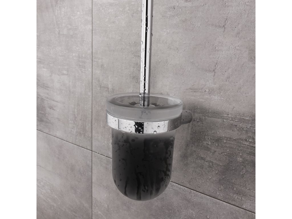 WC štětka s nádobkou z matného skla, nízká. Rukojeť kartáče z mosazi s povrchovou úpravou chrom.