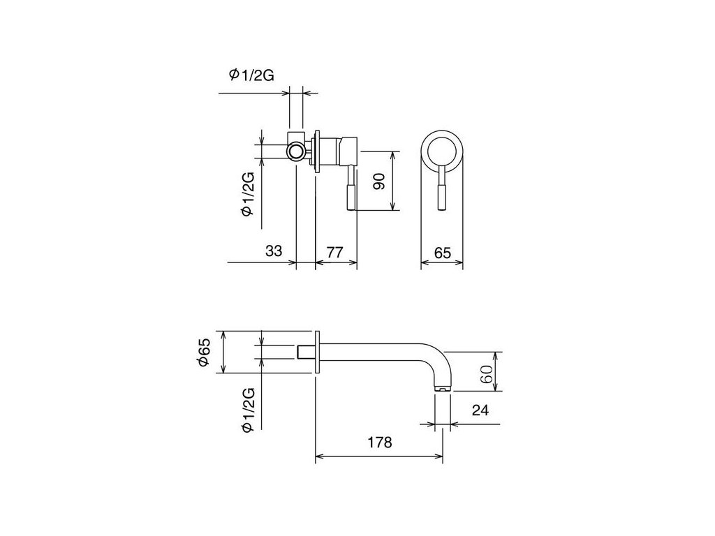 Nástěnná umyvadlová baterie. Délka ramínka je 210 mm. Rozteč rameno - tělo 160 mm