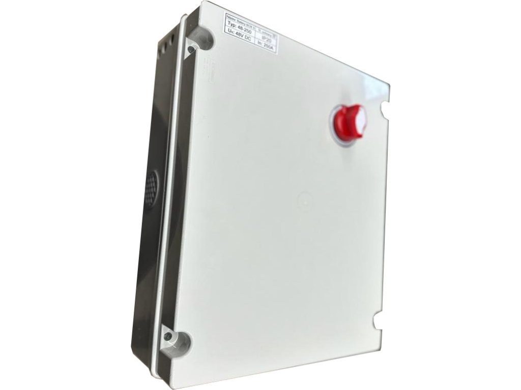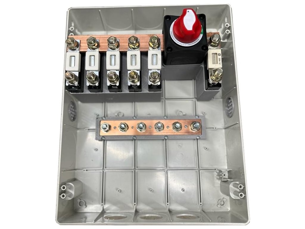 Bateriový odpojovač se sběrnicí využijete pro paralelní propojení 5 baterií a 1 měniče v napěťové hladině 48 V DC. Uvnitř najdete 100A pojistky pro jednotlivé baterie a 250A pro výstup k měniči. Výstup je osazen odpojovačem. Přívodní a odvodní kabely protáhnete trojici otvorů o průměru 55 mm na spodní straně. Svrchní krytka se postará o odvod přebytečného tepla.
