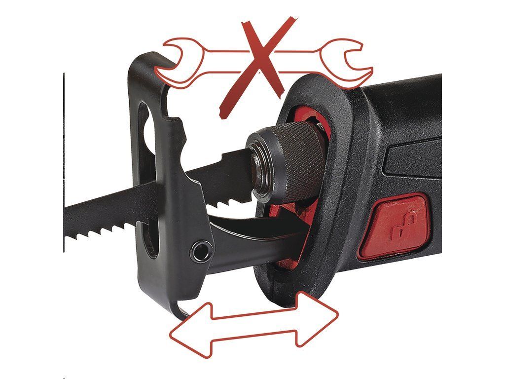 Bez nástrojů upravitelná kluzná patka zajišťuje optimální použití pilové čepele, kterou je také možné bez nástrojů vyměnit. Díky provedení SoftGrip je držení bezpečné i příjemné. Součástí balení je dodatečná gumová podpora pro ochranu pouzdra.