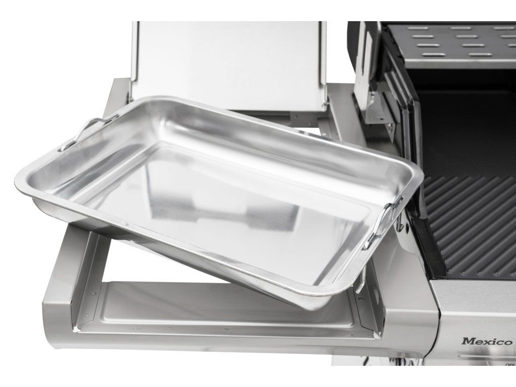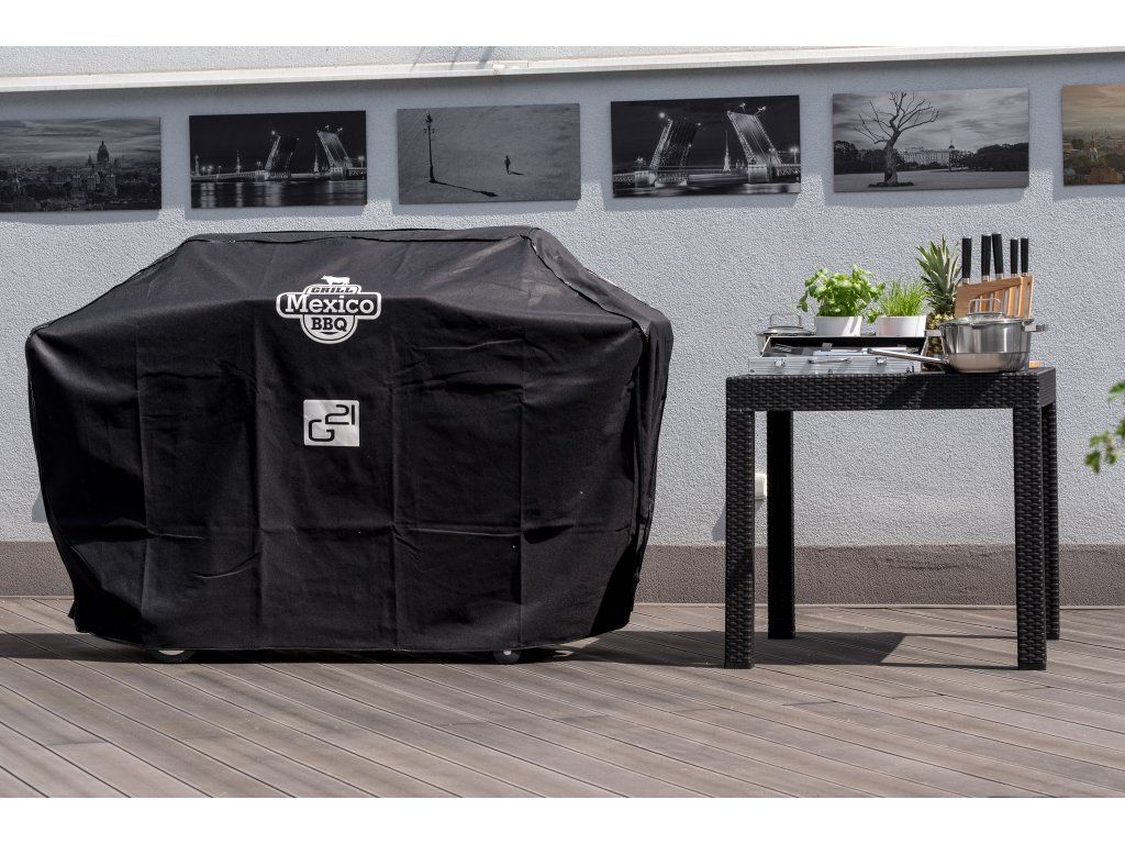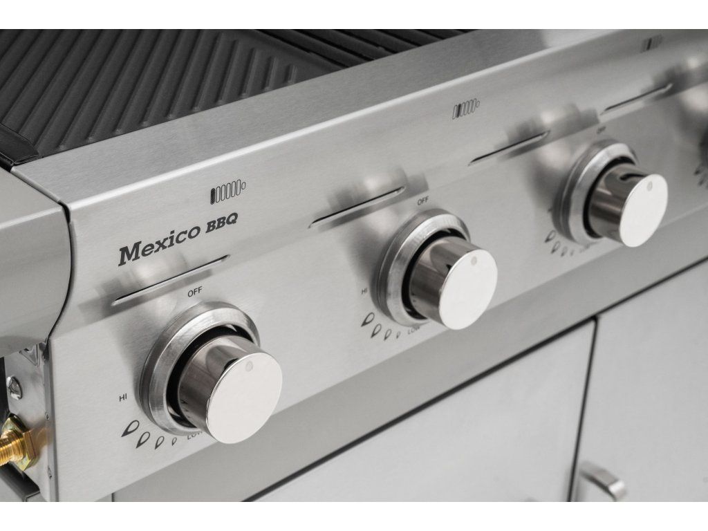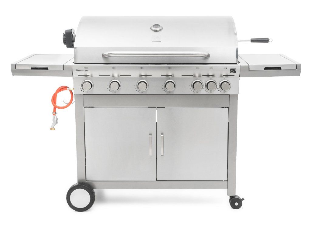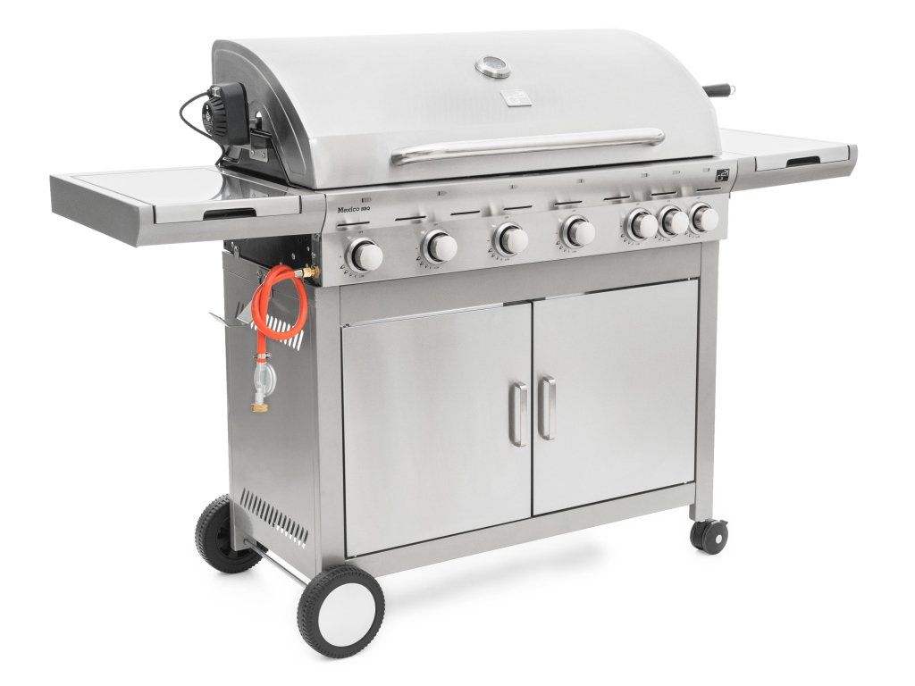 Plynový gril G21 Mexico BBQ Premium Line je vybaven systémem Flame Tamer, 6 hlavními nerezovými hořáky a jedním bočním hořákem s elektrickým zapalováním a plynovou regulací.