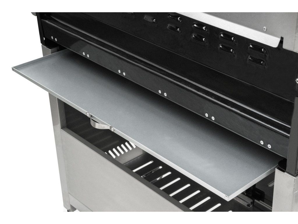 Zahradní nerezový plynový gril je opatřen odklápěcím krytem grilovací plochy a odkládacími poličkami na obou stranách. Pod levou odkládací plochou se skrývá nádobka, kam můžete odkládat např. naložené maso připravené ke grilování. Pod pravou odkládací plochou se nachází boční hořák. Disponuje také litinovou deskou a litinovým roštem. Gril je vyrobený z kvalitního nerezu.