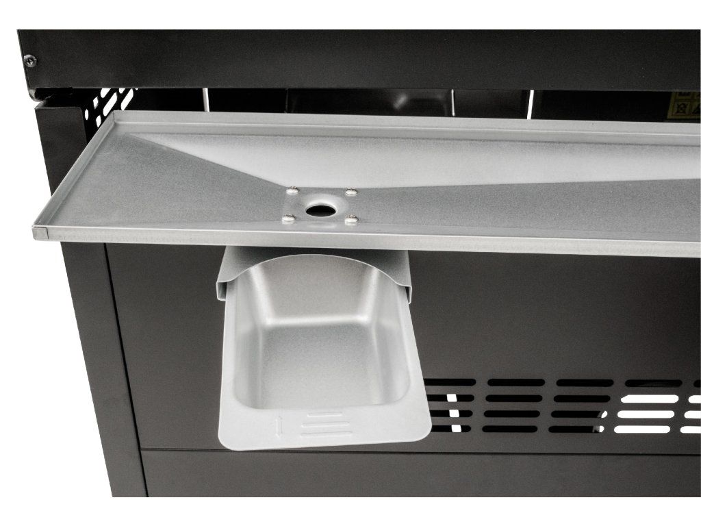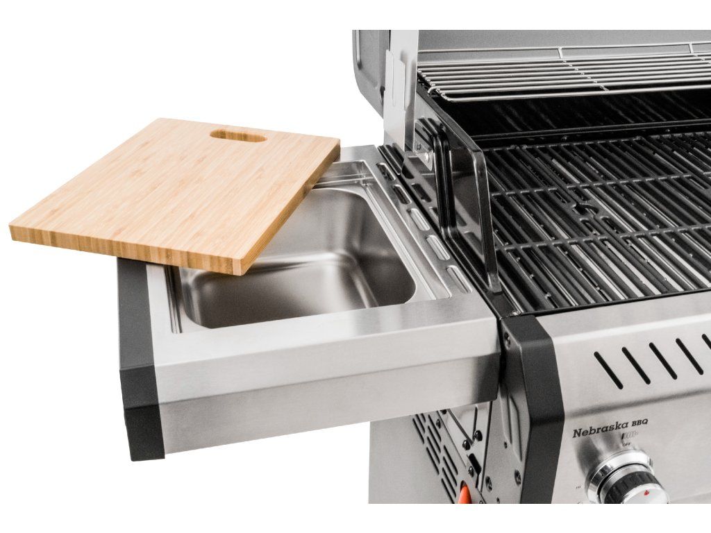 Gril G21 Nebraska BBQ v celonerezovém provedení s atraktivním černým orámováním zaujme už na první pohled. Nejde však jen o design. Nerezová ocel zajišťuje dlouhou životnost, snadnou údržbu a odolnost. Nechybí ani praktické odkládací plochy. Na levé straně grilu najdete stolek s marinovací miskou a dřevěným prkénkem. Vpravo se nachází odkládací stolek s bočním hořákem.