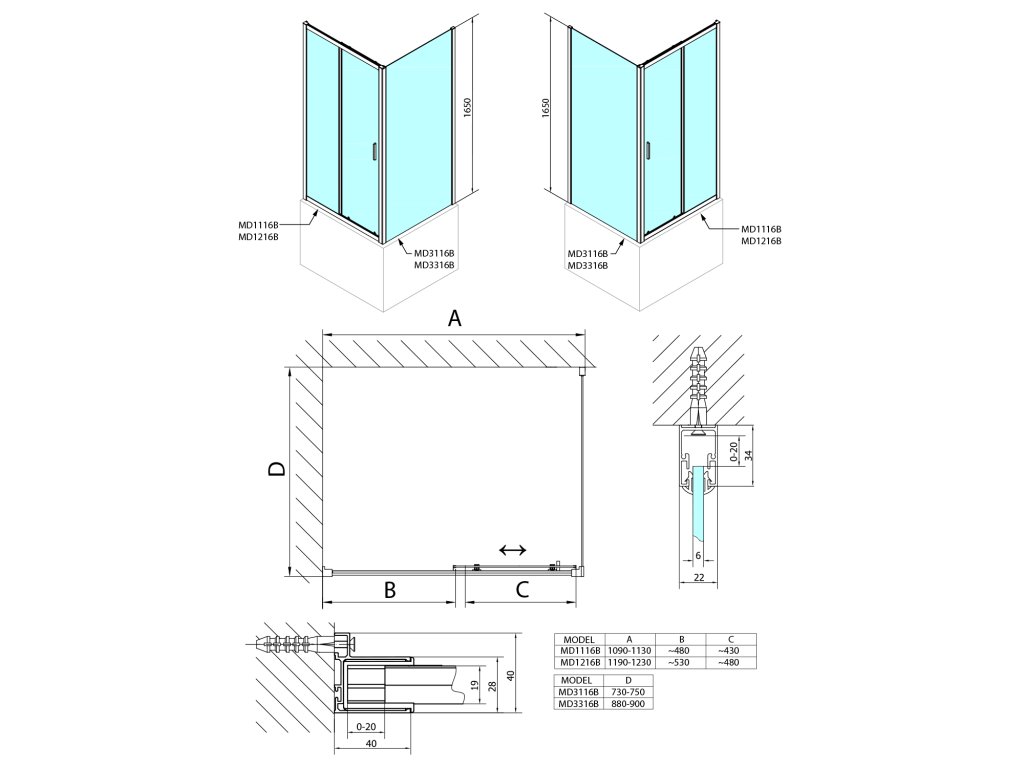 • Snadná montáž, tolerance 20 mm nastavením skel v profilu