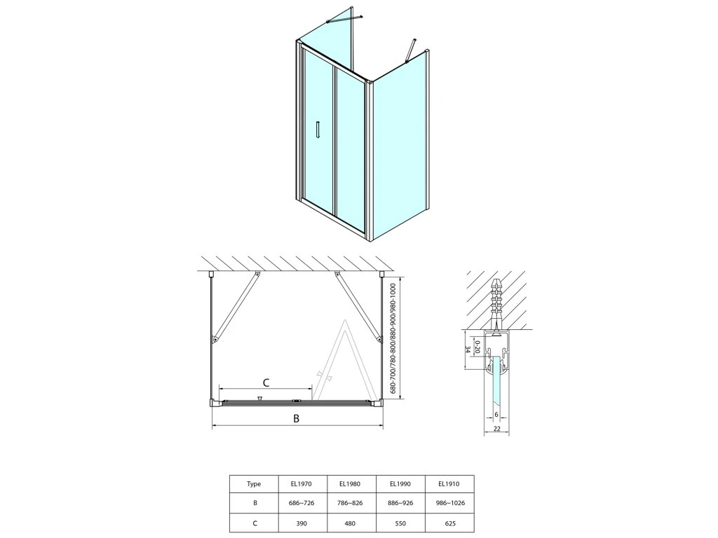 - Instalační rozměr dveří do niky lze díky rozšiřovacímu profilu EL825 zvětšit o 25 mm na každou stranu, celkem o 50 mm