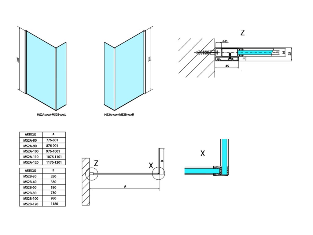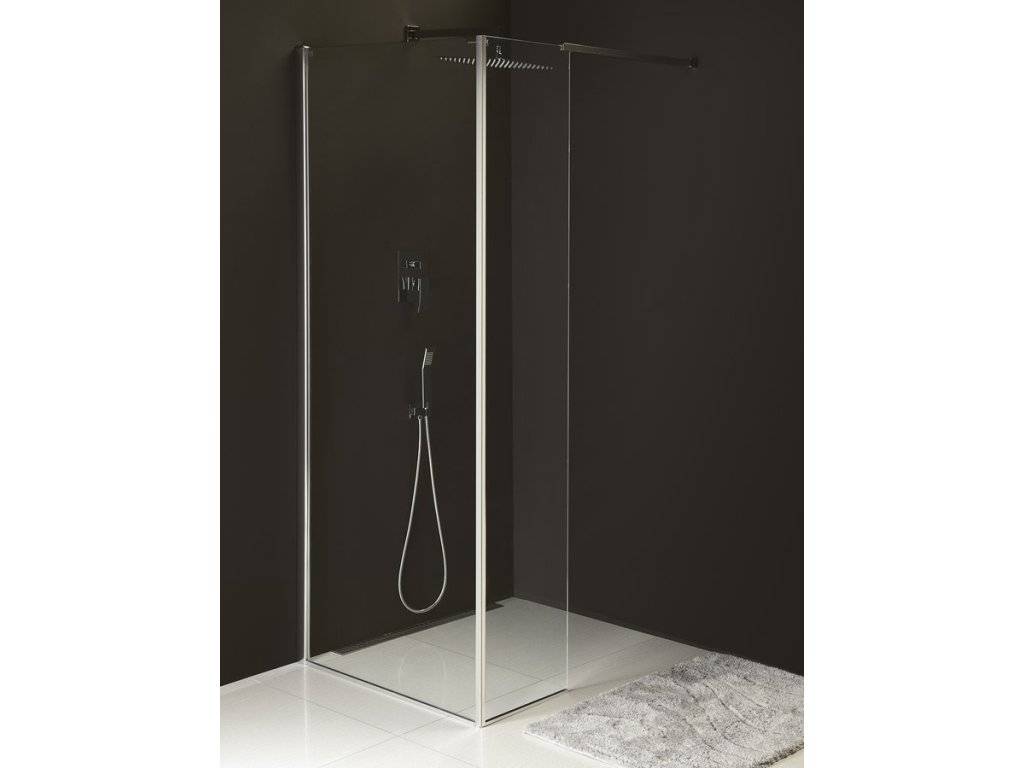 Aby vznikla dvoudílná zástěna ve tvaru "L", je potřeba k pevné stěně dokoupit přídavný pevný panel MS2B.