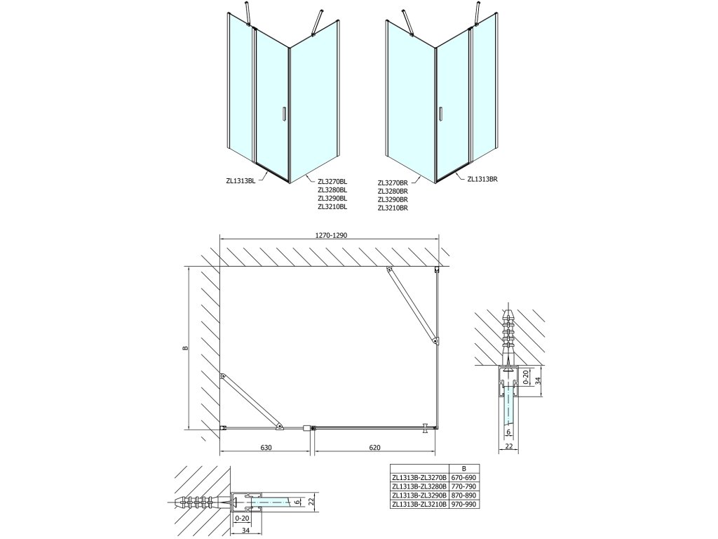• Skládací dveře 700 až 900 mm v provedení levá a pravá lze instalovat do niky nebo v kombinaci L/R vytvořit čtvercovou nebo obdélníkovou zástěnu s rohovým vstupem