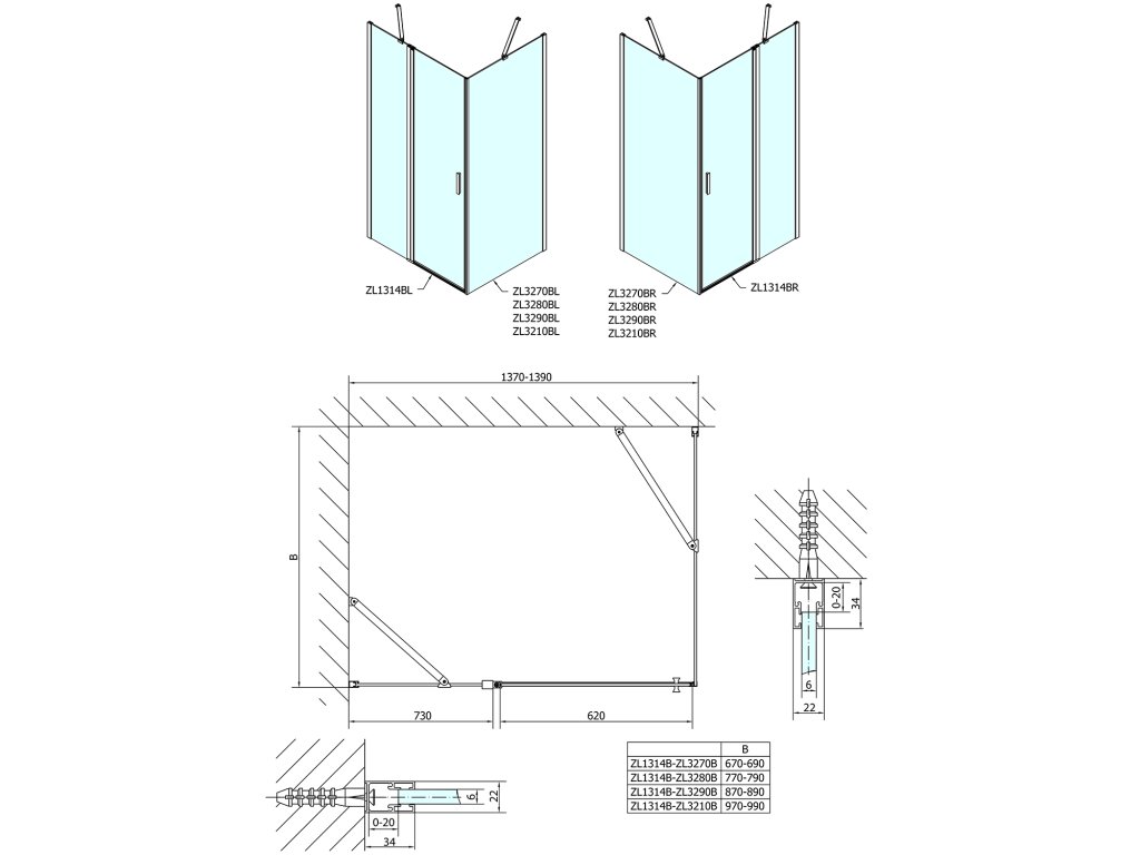 • Skládací dveře 700 až 900 mm v provedení levá a pravá lze instalovat do niky nebo v kombinaci L/R vytvořit čtvercovou nebo obdélníkovou zástěnu s rohovým vstupem