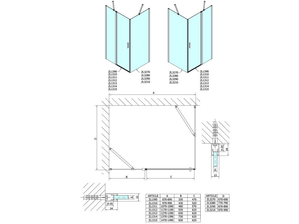 • Dvoukřídlé dveře 800, 900, 1000 a 1200 mm jsou vhodné pouze pro instalaci do niky, nelze je kombinovat s boční stěnou