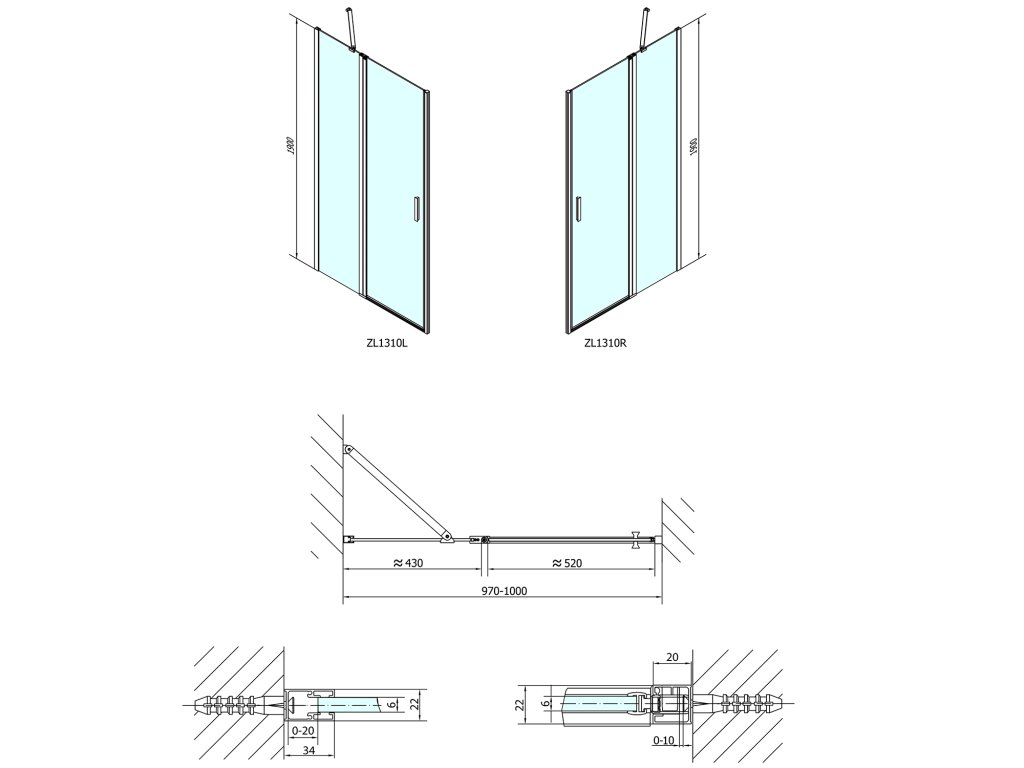 • Dveře 1600 a 1800 mm mají 2 pevné části a 2 otočné části, vhodné pouze pro instalaci do niky, nelze je kombinovat s boční stěnou