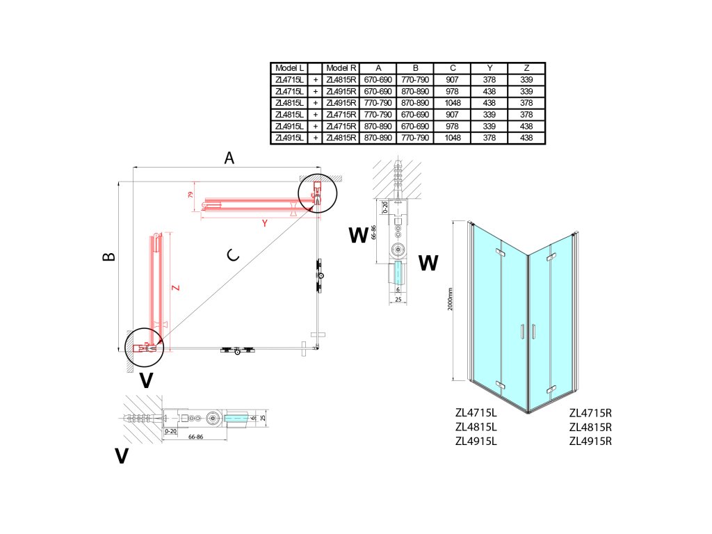 • Skládací dveře 700 až 900 mm v provedení levá a pravá lze instalovat do niky nebo v kombinaci L/R vytvořit čtvercovou nebo obdélníkovou zástěnu s rohovým vstupem
