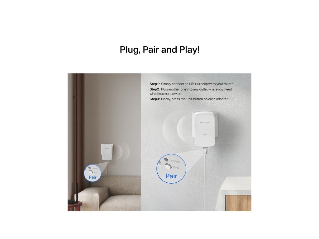Zapojte první adaptér do zásuvky u routeru, druhý do zásuvky u zařízení a stiskněte na obou tlačítko „Pair“ – vytvoření sítě trvá jen pár vteřin. Plug & Play řešení nevyžaduje žádné technické znalosti ani nastavování.