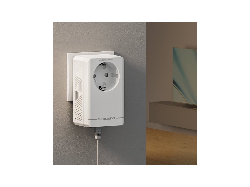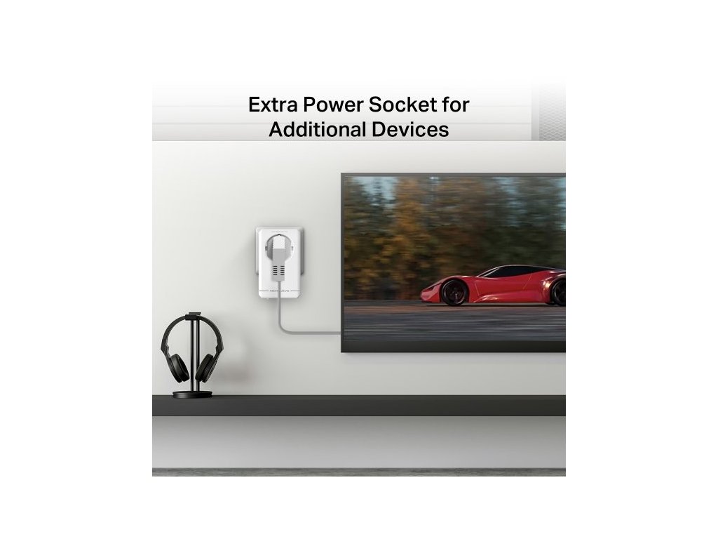 Každý adaptér obsahuje integrovanou zásuvku, která pojme zařízení s příkonem až 16 A. Získáte tak internetové připojení bez ztráty zásuvky – pohodlné a praktické řešení pro každodenní použití.