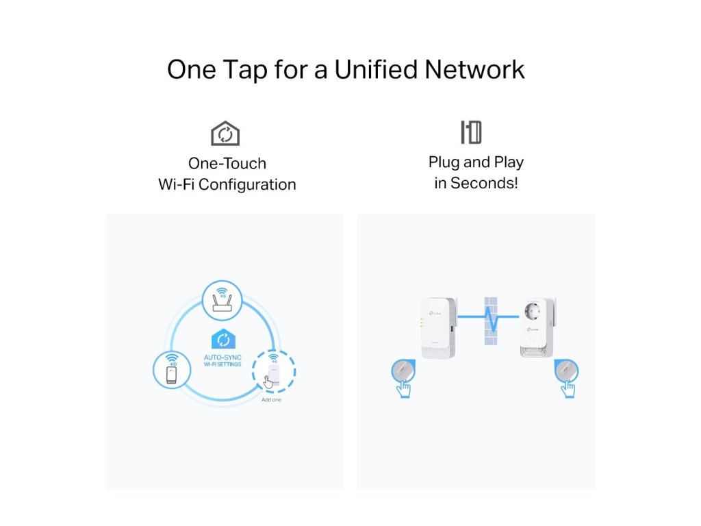 Powerline adaptér, pokročilý protokol G.hn MIMO, 2 + 1 gigabitové porty, dvoupásmová Wi-Fi 6 – 2,4 GHz až 574 Mb/s a v 5 GHz až 1 201 Mb/s, EasyMesh, vestavěná přídavná zásuvka, jednoduché zprovoznění – Plug & Play.