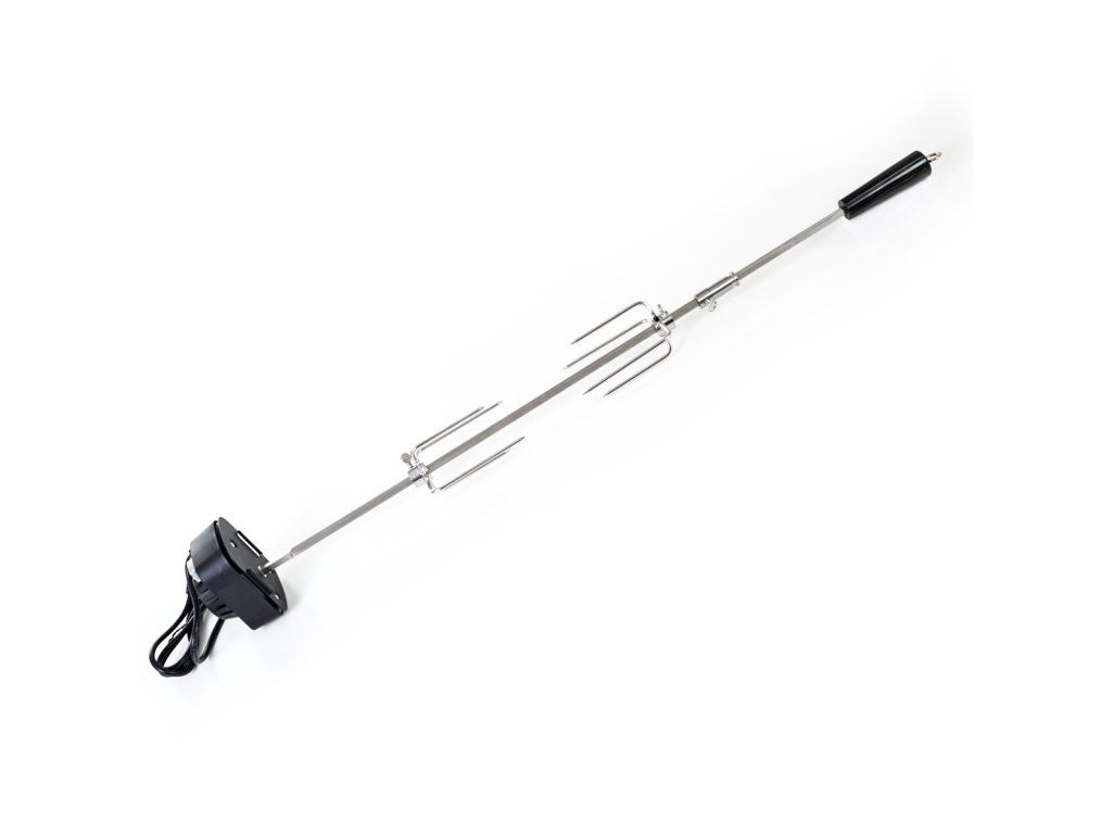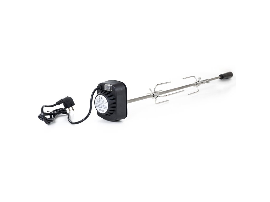 Z jedné strany je jehla opatřena odnímatelným plastovým držadlem, na kterém je praktické očko pro uchycení. Z druhé strany se nachází motorek v plastovém krytu, na kterém je umístěno tlačítko na zapínání / vypínání. Motorek s napětím 230 V jednoduše zapojíte do elektřiny pomocí kabelu v délce cca 125 cm. Motorek s jehlou otáčí rychlostí asi 2 otáčky za minutu, aby se připravovaný pokrm nepřipékal, ale pekl se rovnoměrně.