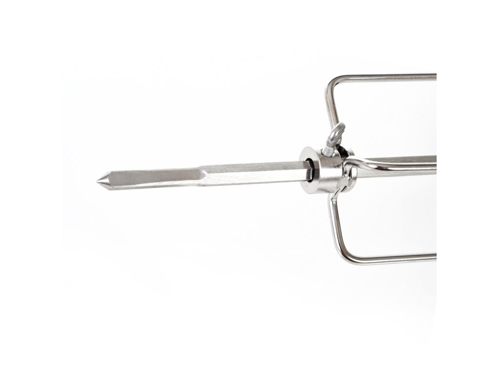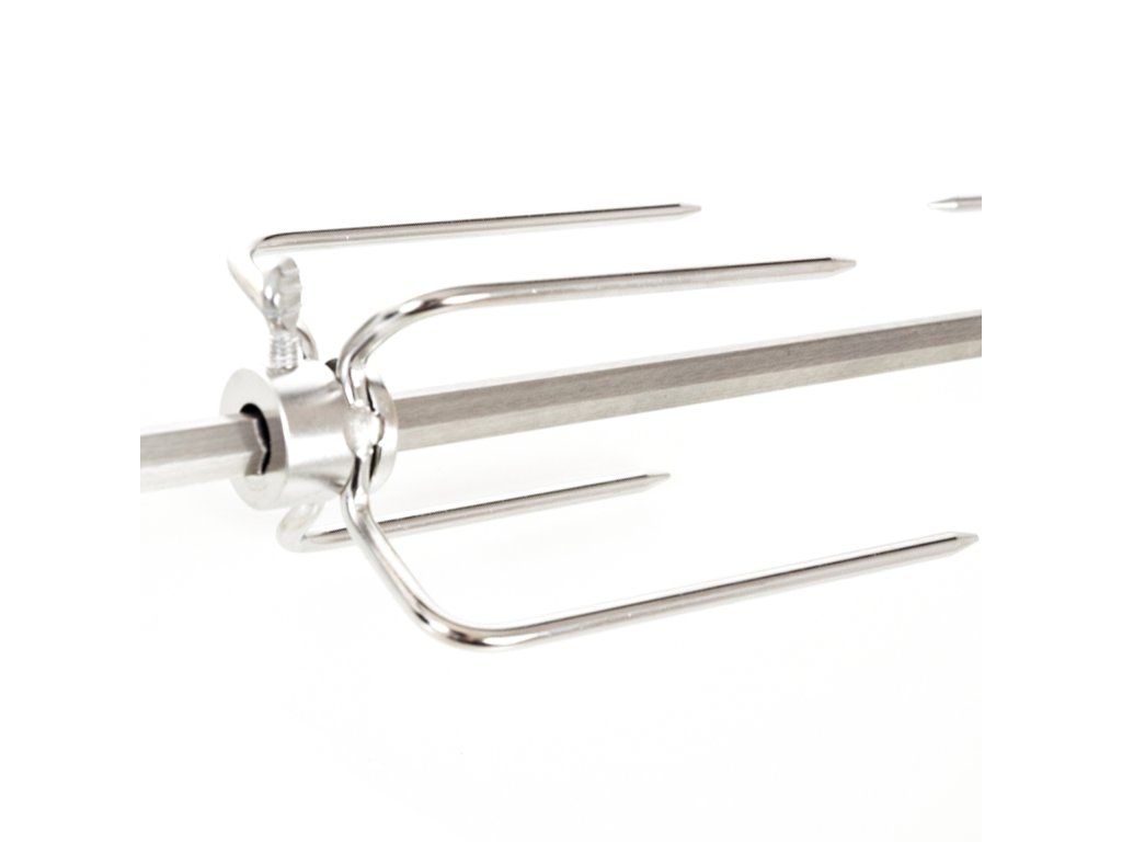 Grilovací jehla s motorem je vyrobena z nerezové oceli a z obou stran je opatřena čtyřmi jehlicemi s aretačními šrouby, díky kterým si můžete jehlice nastavit podle vlastní potřeby.