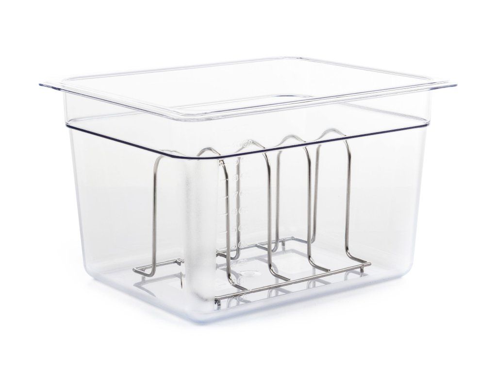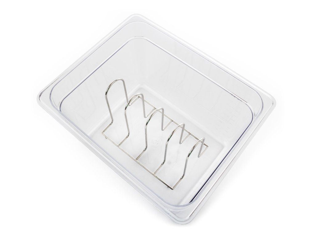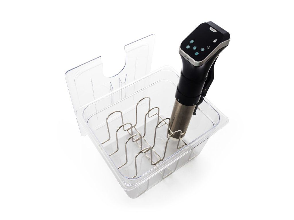 Vyzkoušejte praktický doplněk pro sous-vide vaření. 4místný stojan do kontejnerů a nádob pro vaření metodou sous-vide zachová odstup mezi zavakuovanými balíčky s masem a dalšími surovinami.