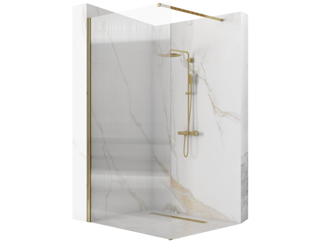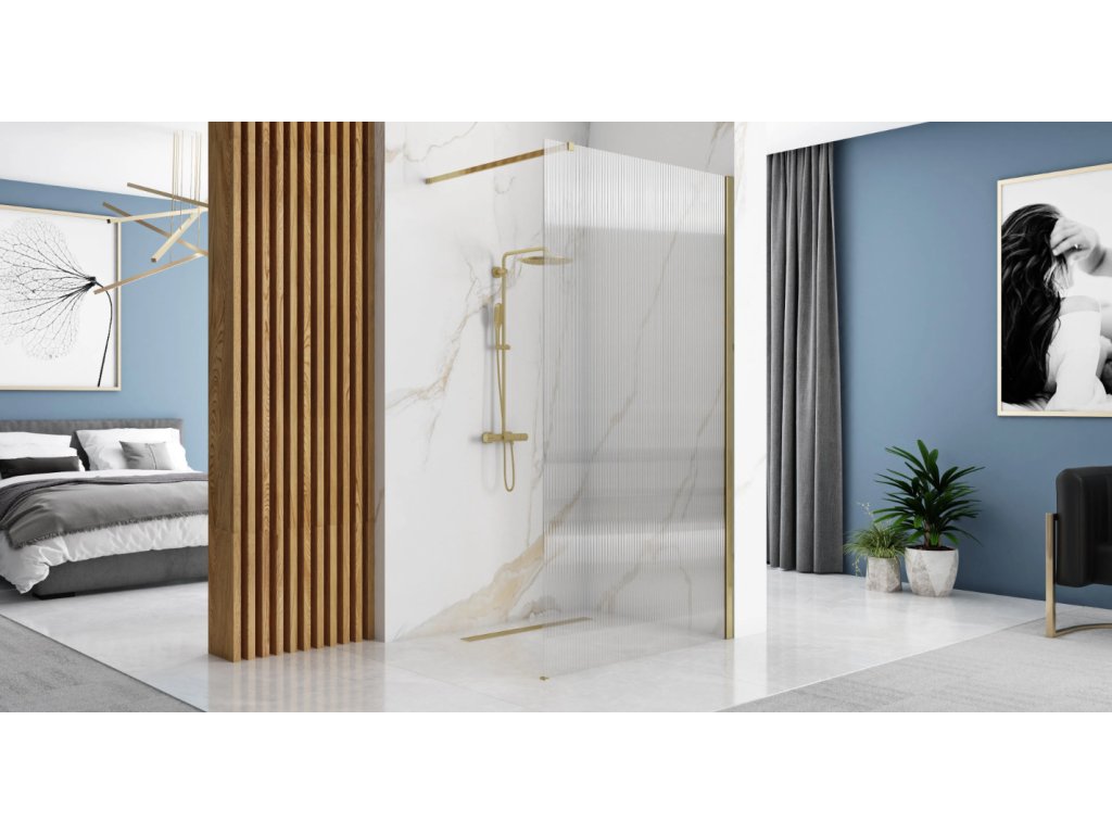 Designová varianta sprchového koutu Walk In se zlatými profily, která se řadí mezi z jedny nejmodernějších trendů ve vybavení koupelen. Jedná se o otevřený sprchový kout, tvořený jednou stěnou z bezpečnostního tvrzeného skla, zabraňující nechtěnému rozstřiku vody. Skla jsou v rýhovaném provedení, díky kterému sprchové dveře působí intimněji. Povrchová úprava Easy Clean zabraňující usazování nečistot a tvorbě tzv. map po stékající vodě na skle. Voda je odváděna odtokovým kanálkem, umístěným v podlaze. Univerzální provedení pravé nebo levé varianty si dle potřeby zvolíte při montáži. Sprchový kout Aero dodá Vaši koupelně na moderním a čistém vzhledu a Vaše koupelna získá ojedinělý designový nádech v nejmodernějším trendu.