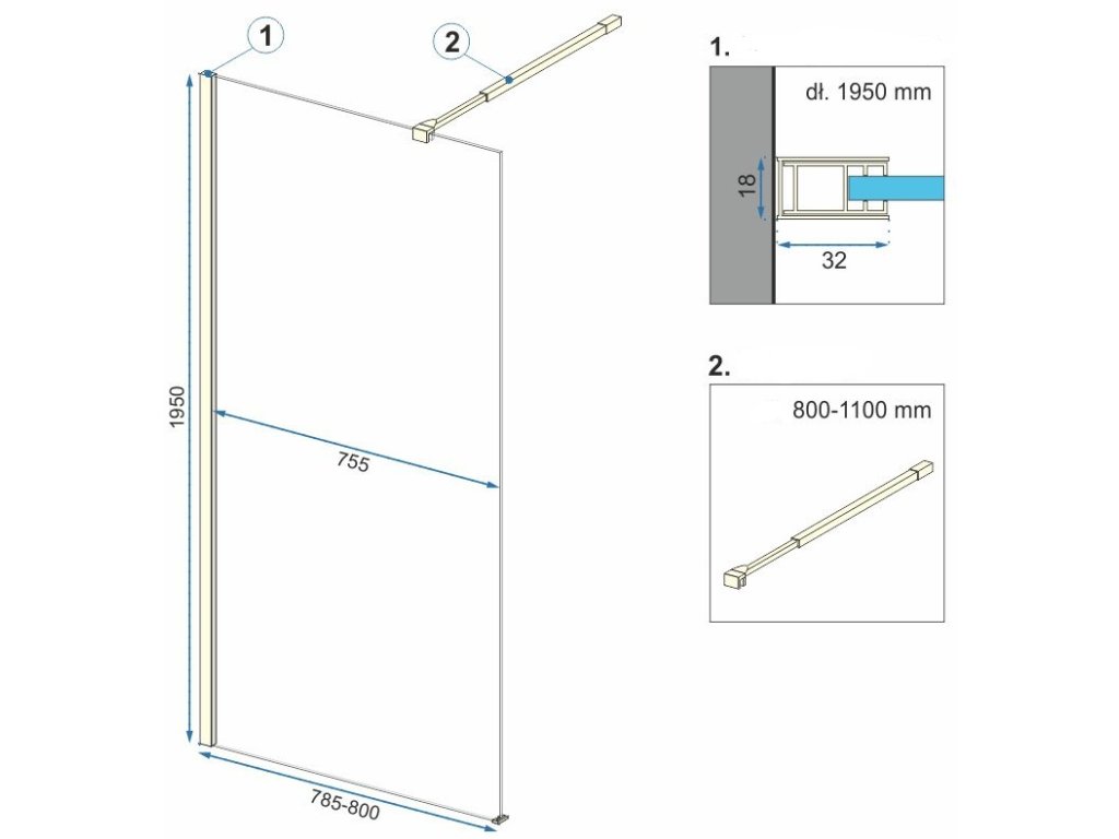 Tabulka rozměrů sprchového koutu Aero Walk In