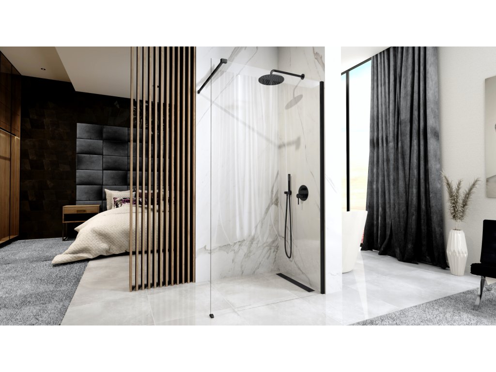 Designová varianta sprchového koutu Walk In se černými profily, která se řadí mezi z jedny nejmodernějších trendů ve vybavení koupelen. Jedná se o otevřený sprchový kout, tvořený jednou stěnou z bezpečnostního tvrzeného skla, zabraňující nechtěnému rozstřiku vody. Povrchová úprava Easy Clean zabraňující usazování nečistot a tvorbě tzv. map po stékající vodě na skle. Voda je odváděna odtokovým kanálkem, umístěným v podlaze. Univerzální provedení pravé nebo levé varianty si dle potřeby zvolíte při montáži. Černé prvky jsou laserem čtyřikrát potaženy povlakem nejvyšší kvality. Díky této technice jsou hliníkové profily chráněny proti korozi, poškození a zabarvení. Sprchový kout Aero dodá Vaši koupelně na moderním a čistém vzhledu a Vaše koupelna získá ojedinělý designový nádech v nejmodernějším trendu.