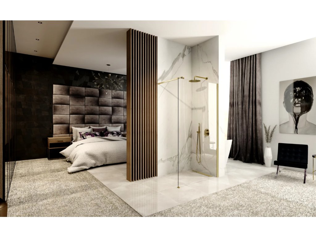 Designová varianta sprchového koutu Walk In se zlatými profily, která se řadí mezi nejmodernější trend ve vybavení koupelen. Jedná se o otevřený sprchový kout, tvořený jednou stěnou z bezpečnostního tvrzeného skla, zabraňující nechtěnému rozstřiku vody. Povrchová úprava Easy Clean zabraňující usazování nečistot a tvorbě tzv. map po stékající vodě na skle. Voda je odváděna odtokovým kanálkem, umístěným v podlaze. Univerzální provedení pravé nebo levé varianty si dle potřeby zvolíte při montáži. Zlaté prvky jsou laserem čtyřikrát potaženy povlakem nejvyšší kvality. Díky této technice jsou hliníkové profily chráněny proti korozi, poškození a zabarvení. Sprchový kout Aero dodá Vaši koupelně na moderním a čistém vzhledu a Vaše koupelna získá ojedinělý designový nádech v nejmodernějším trendu.