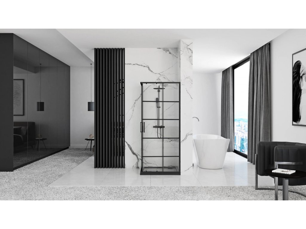 Rubik, s nádechem geometrických prvků, je velice nadčasový a designový sprchový kout, který je vyroben z těch nejkvalitnějších materiálů. Černá je hlavním lídrem na trhu interiérů koupelen a proto jeho černé profily dodají koutu ten správný nádech moderny. Skla jsou odolná vůči nečistotám a skvrnám. Kombinace černých profilů a černého svislého úchytu spolu s transparentním sklem dokonale ladí s moderní trendy koupelnou.