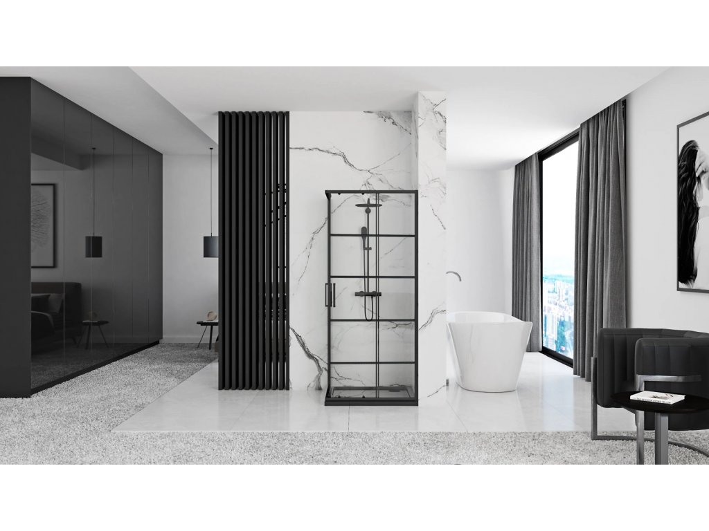 Concept, s nádechem geometrických prvků, je velice nadčasový a designový sprchový kout, který je vyroben z těch nejkvalitnějších materiálů. Černá je hlavním lídrem na trhu interiérů koupelen a proto jeho černé profily dodají koutu ten správný nádech moderny. Skla jsou odolná vůči nečistotám a skvrnám. Kombinace černých profilů a černého svislého úchytu spolu s transparentním sklem dokonale ladí s moderní trendy koupelnou