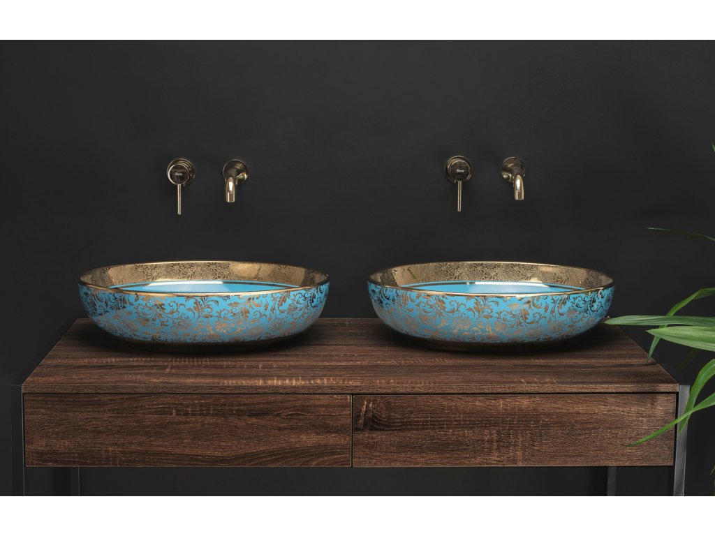 Představujeme Vám orientální a velice krásné umyvadlo ve zlaté barvě s kombinací modrou glazurou. Umyvadlo Margot přinese eleganci do Vaší koupelny, kde se může stát jemným, ale nepřehlédnutelným doplňkem. Zaměříme-li se na nádheru této ušlechtilé barvy, konečný efekt jistě získá lehkost a originalitu. Je vyrobeno z vysoce kvalitní sanitární keramiky. Umyvadlo je odolné vůči nečistotám a jeho údržba je tím jednoduchá.