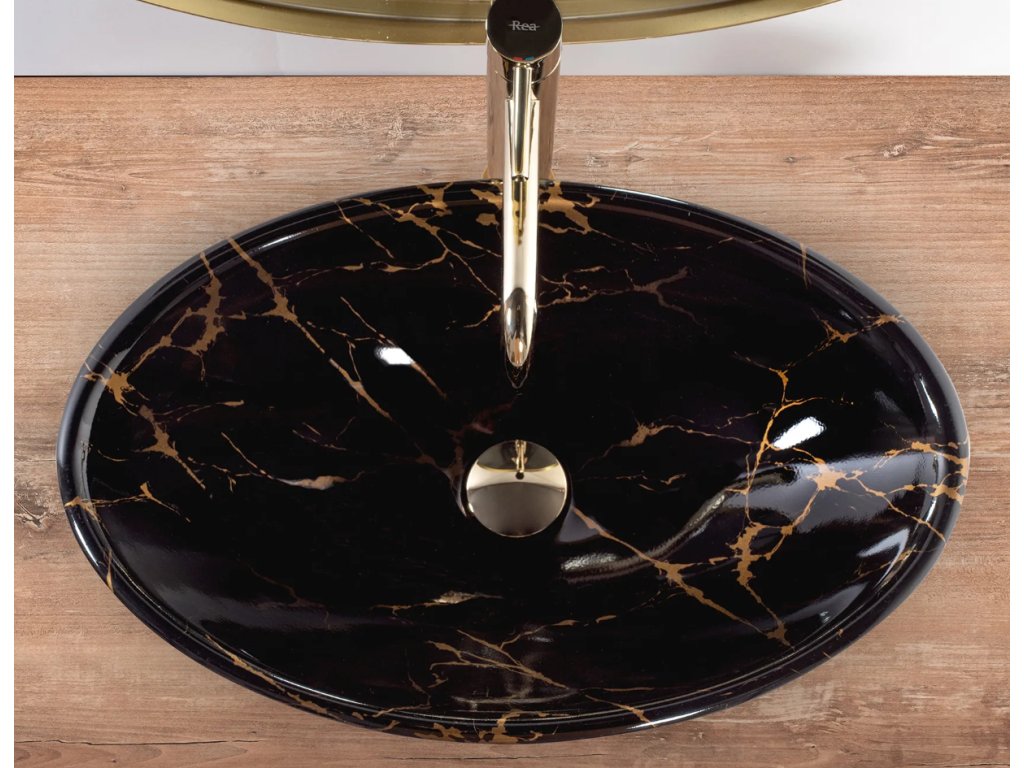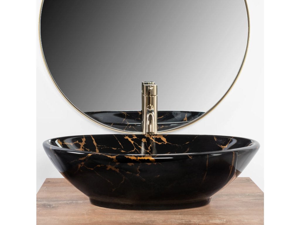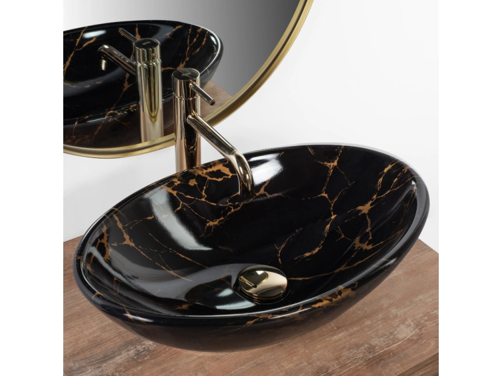 Designové umyvadlo na desku Pamela v černé ve vysokém lesku se zlatými žilami. Nadčasový tvar a rozměry umožní dokonalé uspořádání i v malých koupelnách. Umyvadlo je vyrobeno z vysoce kvalitní keramiky, která zaručuje bezchybný vzhled a použití po celá léta. Díky speciální povrchové úpravě je odolné a snadno se čistí.