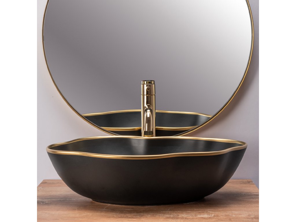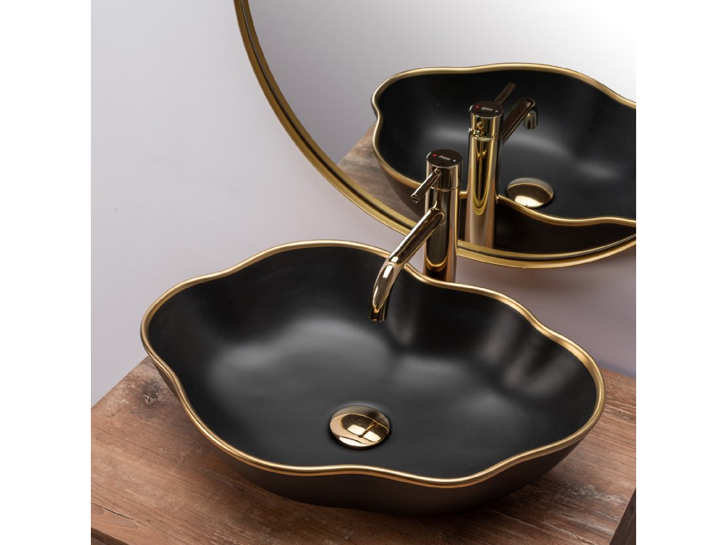 Představujeme Vám moderní, unikátní umyvadlo v černé a zlaté barvě a neobvyklém tvaru. Umyvadlo Pearl přinese eleganci do Vaší koupelny, kde se může stát jemným, ale nepřehlédnutelným doplňkem. Zaměříme-li se na nádheru této ušlechtilé barvy, konečný efekt jistě získá lehkost a originalitu. Je vyrobeno z vysoce kvalitní sanitární keramiky. Umyvadlo je odolné vůči nečistotám a jeho údržba je tím jednoduchá.