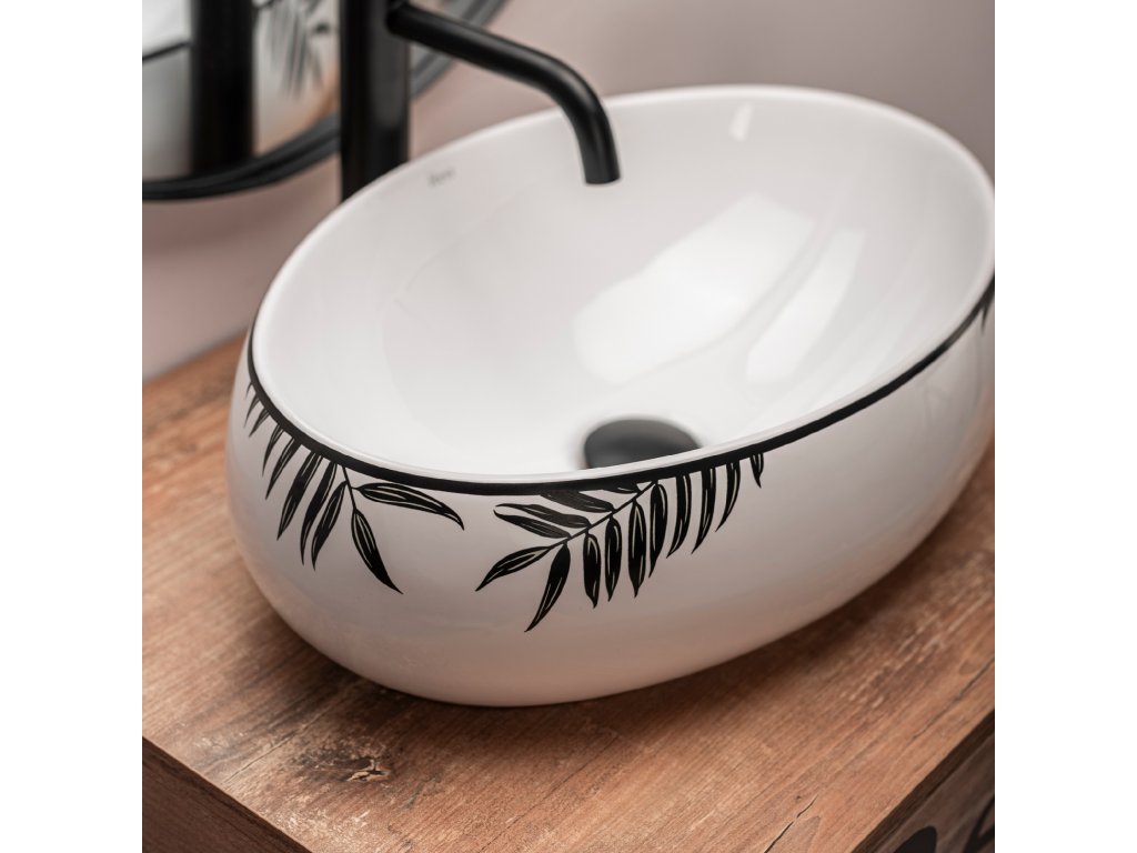 - bílé umyvadlo na desku s černým dekorem lístečků