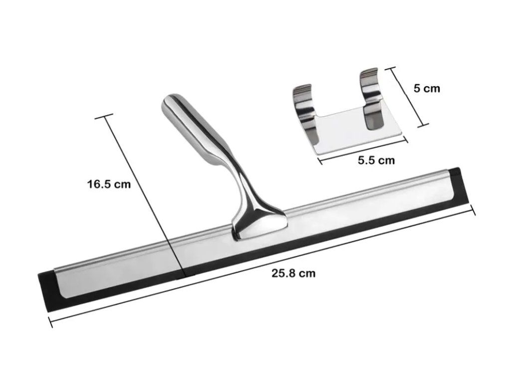 Elegantní koupelnová stěrka s rukojetí a držáku je dokonalým řešením pro udržení čistoty v koupelně. Díky stěrce snadno a rychle odstraníte přebytečnou vodu z povrchu skla bez vytváření nežádoucích šmouh. Sada obsahuje držák, který lze namontovat na zeď bez vrtání.