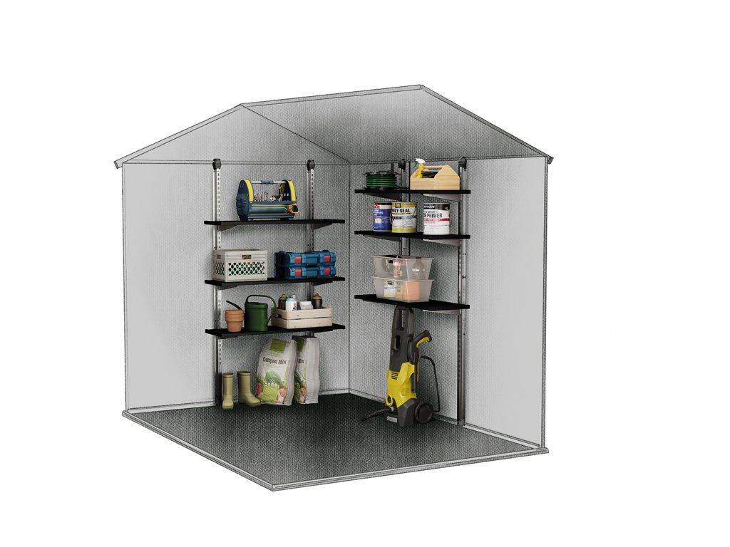 Už vás nebaví, že se vám všechny věci uschované v domku Keter válí na hromadě na podlaze? Pořiďte si praktický regál Keter Shelving Kit 100. Pozinkované ocelové kolejnice namontujete na stěnu domku. Výšku si nastavíte v rozmezí od 169 do 181 cm podle vlastních potřeb.